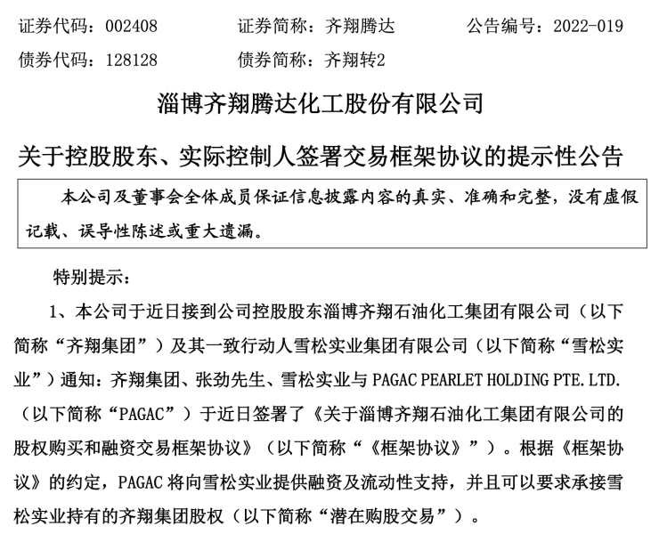 根据公告,齐翔腾达控股股东齐翔集团及其一致行动人雪松实业、实际控制人张劲先生基于自身资金需求,同时基于公司长远发展需要,同意转让公司控制权。目前齐翔集团、张劲、雪松实业与太盟投资集团签署了《股权购买和融资交易框架协议》。