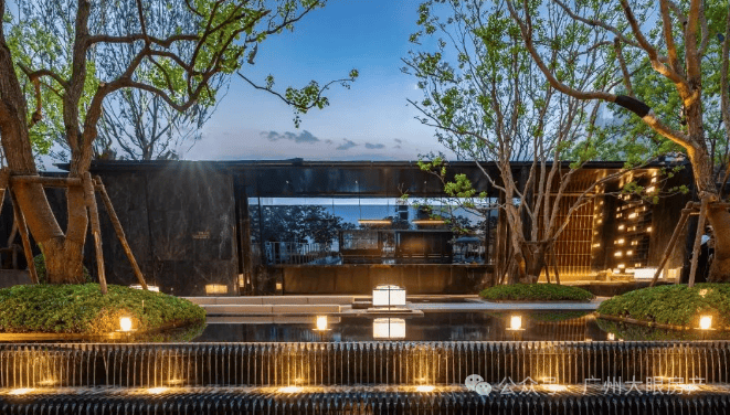 夜幕降临时,富有层次感的氛围灯,零星点缀,映照在潺潺跌水、安哥拉黑石台上,又给人一种高贵又内敛的感觉。