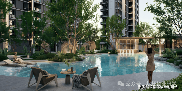 正是绿城首度落地的3.0泳池综合体。这一空间位于社区核心,归家必经之路上,融合中心泳池、林下客厅、卡座与廊架,成为串联生活场景的视觉与功能中心。与立体水院动静相衬,约34米泳池深浅分区,满足孩童嬉戏与成人畅游。池畔一侧为健身区,一侧为书吧,运动挥汗与静心阅读和谐并存,让身心各得其所。
