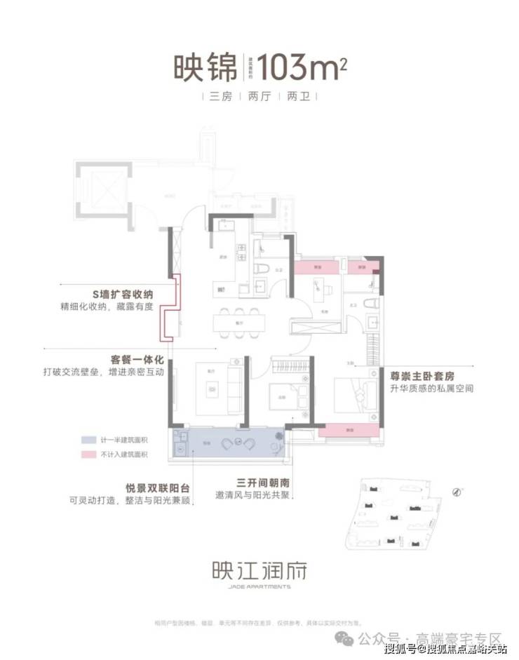 项目建面约103㎡中间套几乎保留了上述户型所有惊艳亮点,包括客餐一体化、双联阳台+多飘窗附赠、三开间朝南、套房主卧等。