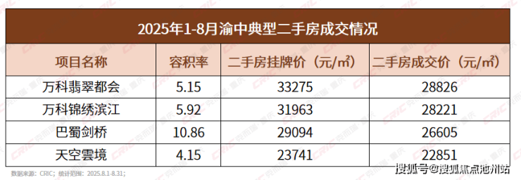 克而瑞数据显示,近一年万科翡翠都会、万科锦绣滨江、巴蜀剑桥等品质项目,凭借其地段优势,二手房挂牌单价普遍站上3.2-2.8万元/㎡的高位,而成交均价也在2.8-2.5万元/㎡之间。