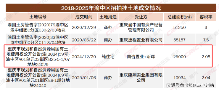 渝中区的供应稀缺,首先源于“源头断供”—— 住宅用地长期缺位,导致新房市场选择有限。克而瑞数据显示,2018年至2025年之间,共有4宗土地成交,但其中3宗均为商办用地,纯住宅用地有且只有一宗,即见山台所在地块,其余年份均无住宅用地供应。