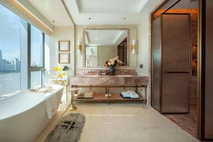 • 细节较真到离谱:弧形墙面不用拼接工艺,直接整块意大利洞石切割;实木地板要进实验室做7天7夜温湿循环测试,就为了适应江畔环境;电视背景墙用普拉达绿奢石,卫生间铺香格里拉翡翠、米兰红奢石,嘉格纳电器、德国雅生龙头、土耳其巴斯蒂姆五金,全是行业顶尖品牌;