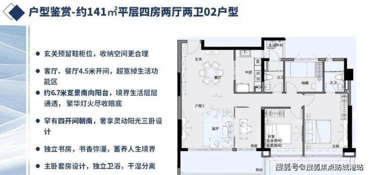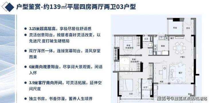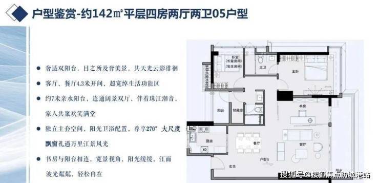 建面约139-142平方米四房两卫:市区稀有的约3.15米层高大宅,空间体验感开阔;6-7米双联阳台,其中02户型带双阳台,05户型主卧270°飘窗。