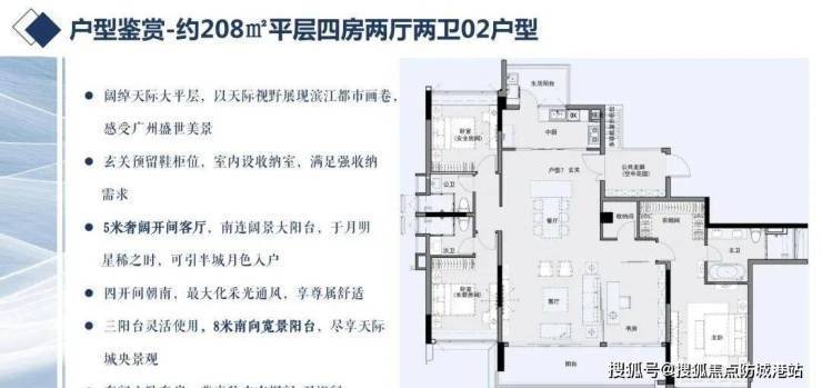 建面约208平方米四房三卫:2梯2户专属入户空间,市区稀有的约3.15米层高大宅,空间体验感开阔;5米客厅开间,8米南向阳台,双主套双阳台,主卧套房尊享独立衣帽间+卫浴间;约16米采光面,四开间朝南,南北通透。