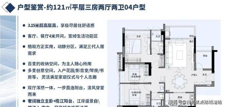 建面约121平方米四房两卫:市区稀有的约3.15米层高大宅,空间体验感开阔;客餐厅4米开间,主卧带衣帽间,U型厨房,公卫干湿分离,格局方正实用,动静分区。