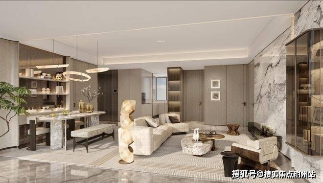 再看下室内装修效果,感受一下这个尺度。厨房、餐厅、客厅很大,一眼望过去完全有160㎡以上大平层的既视感了!