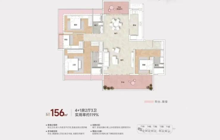 最稀缺的约156平四房,可以扩展成4+1房2厅3卫的格局。