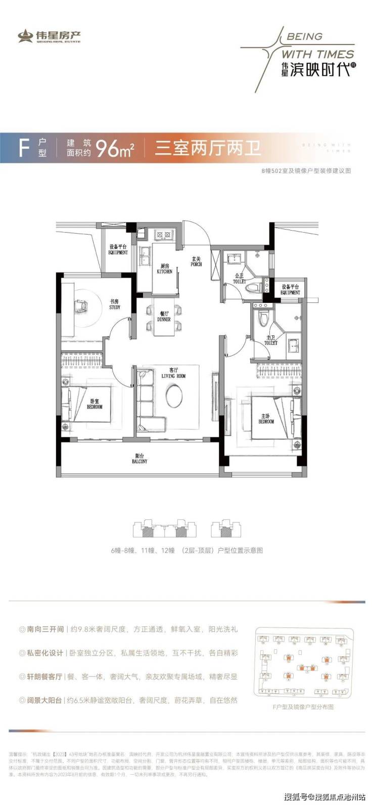 首次置业人群可选建面约95方三房:建面约95㎡为三房格局,2卧+餐客厅三开间朝南,餐客厅连接阳台,2卧自带飘窗,采光通风是同类面积段的极致。