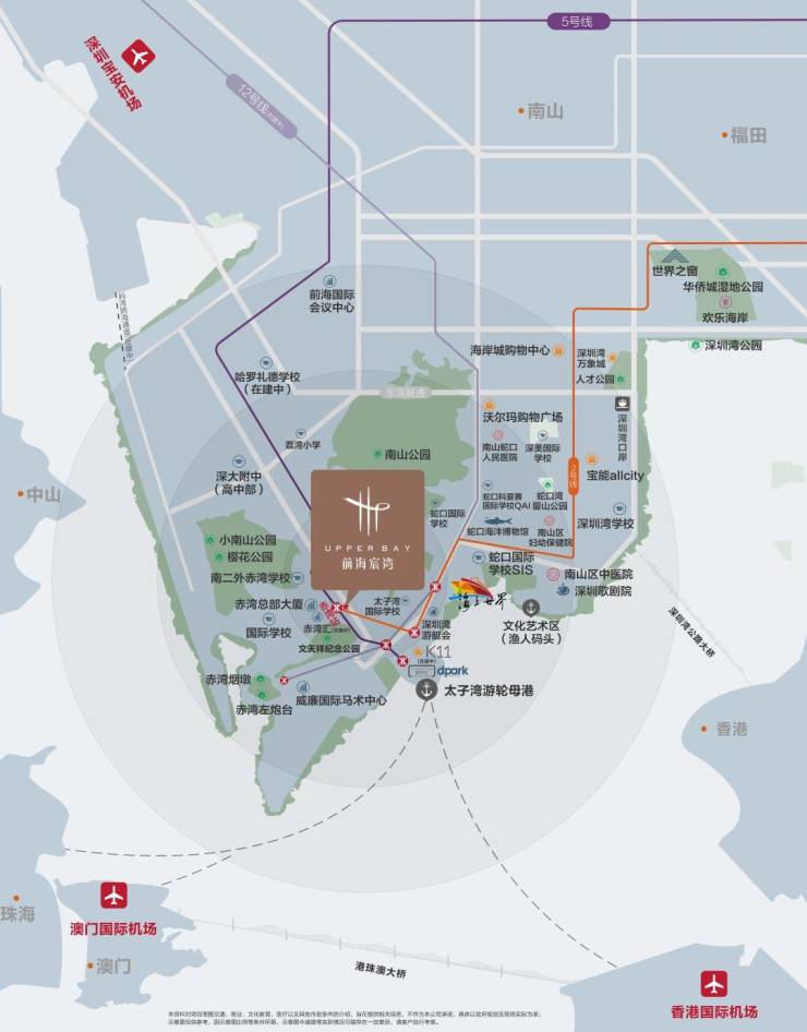 航空港口:经沿江高速速达宝安机场、经蛇口港便捷通达澳门和香港、经深圳湾口岸抵达香港中环。