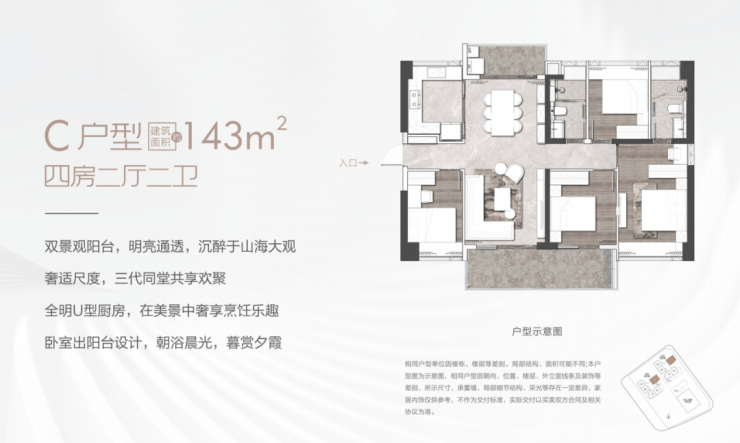 143㎡的奢阔户型,特别打造了双景观阳台,明亮通透,山海美景一览无余,每一个空间都是大尺度,能一步到位满足每个人生阶段的不同家庭格局需求,无论三代同堂还是多胎家庭,实现一步到位。