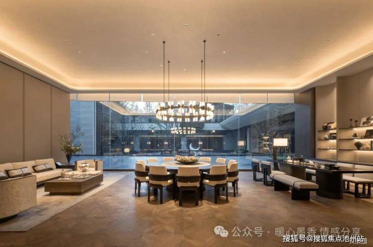 约800㎡下沉庭院,造价30万的汉白玉琉璃皓月雕塑悬于中央,与50万乌桕树王的苍劲在此对话。十二星宿灯光如银河散落,夜归时分,俯仰世界,浩瀚尽此眼前。