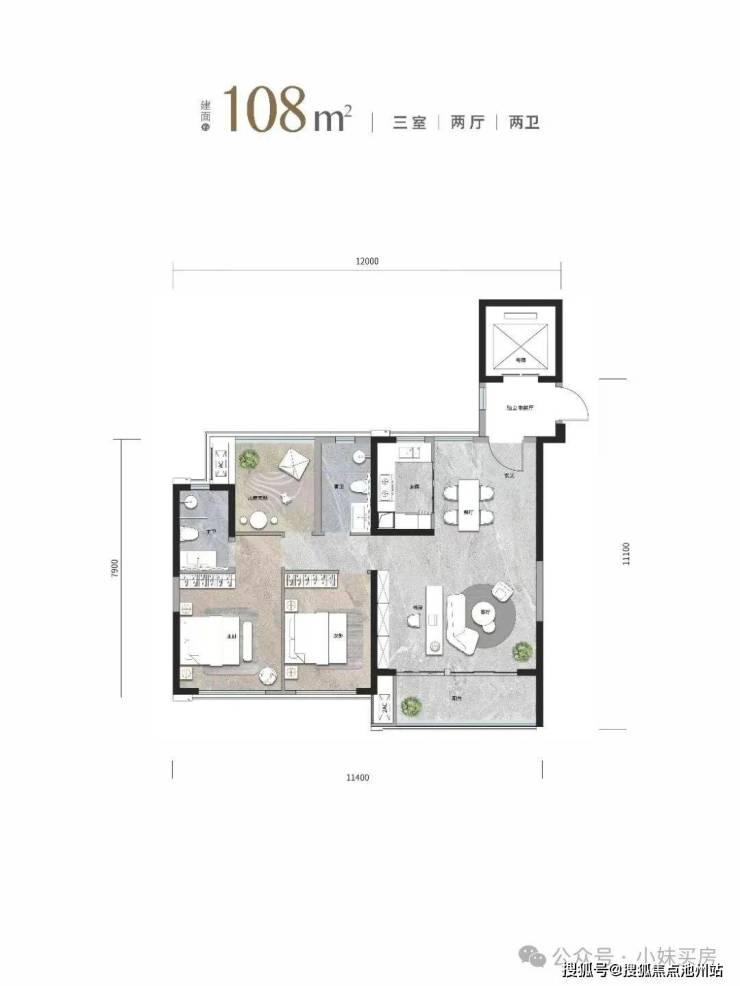 89平户型就做到了三开间朝南,还是三房两卫格局,南向面宽约9.3米,89平就做到了市面上100平普通户型的功能性。