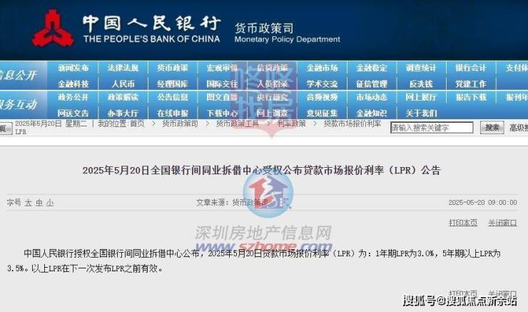 中国人民银行授权全国银行间同业拆借中心公布,2025年5月20日贷款市场报价利率(LPR)为:1年期LPR为3.0%,5年期以上LPR为3.5%。以上LPR在下一次发布LPR之前有效。