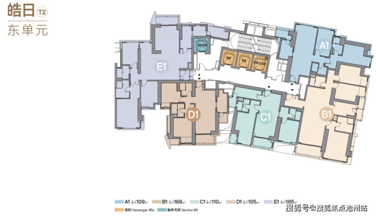 为满足高净值精英阶层的生活需求,我们打造的两栋不同面积段的户型,T1御峯建筑面积约310-360㎡,T2皓日建筑面积约105-185㎡。