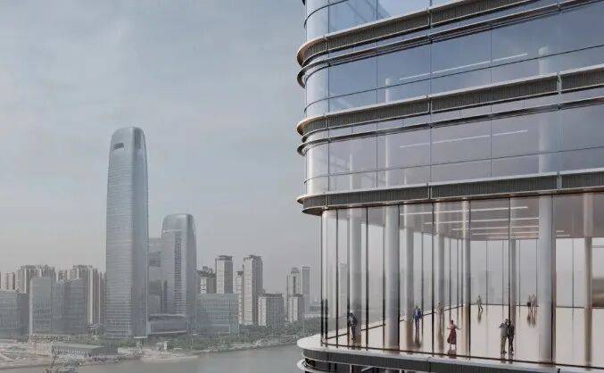 外立面采用木色陶板与全景玻璃幕墙,以“曲水流觞”的涟漪造型呼应珠江文脉,同时融入垂直生态理念,打造空中绿岛与可呼吸的建筑肌理。