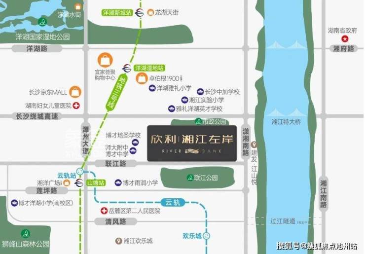 项目地处洋湖南板块,距离地铁3号线山塘站约900米,距离湘江特大桥约400米,步行可达湘江风光带,小区出门便是联江公园,北面还紧挨着市政公园,都是业主日常休闲的好去处。