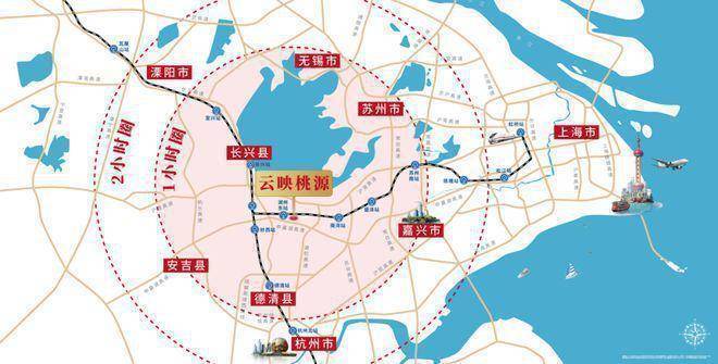 云映桃源位于长三角中心区域,连接长三角南北两翼和东中部地区的节点城市,环杭州湾大湾区,上海同城化都市圈,承接区域发展红利。
