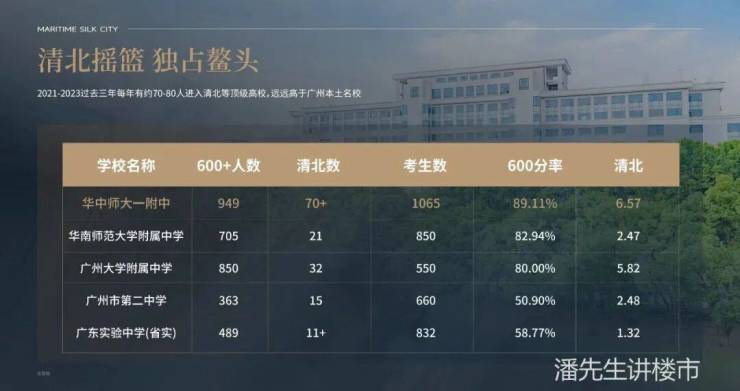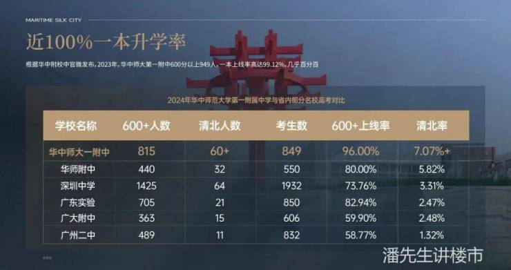 很多人估计对华中师范大学第一附属中学不太了解,这是一所全国顶级学校,被誉为清北摇篮,哪怕是广州的华师附都要避让三分,并且连续6年霸榜全国百强中学首位,潘先生也是湖北的,对于这个学校的含金量那是相当了解的,这是看后期的师资和教育模式,会不会水土不服大家拭目以待,但毕竟名校加持,也是楼盘的加分项。