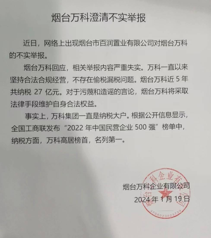 1月20日,烟台万科针对近期相关项目被举报偷逃税一事作出回应:“严重失实。”