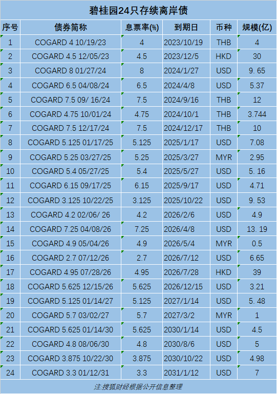 据搜狐财经统计,碧桂园如今存续离岸债券共有24只,合计规模约107亿美元,主要集中在2024年至2026年到期。其中,有2笔离岸债合计约3.95亿美元在2023年内到期,“COGARD 4 10/19/23”于10月19日到期,“COGARD 4.5 12/05/23”于12月5日到期。