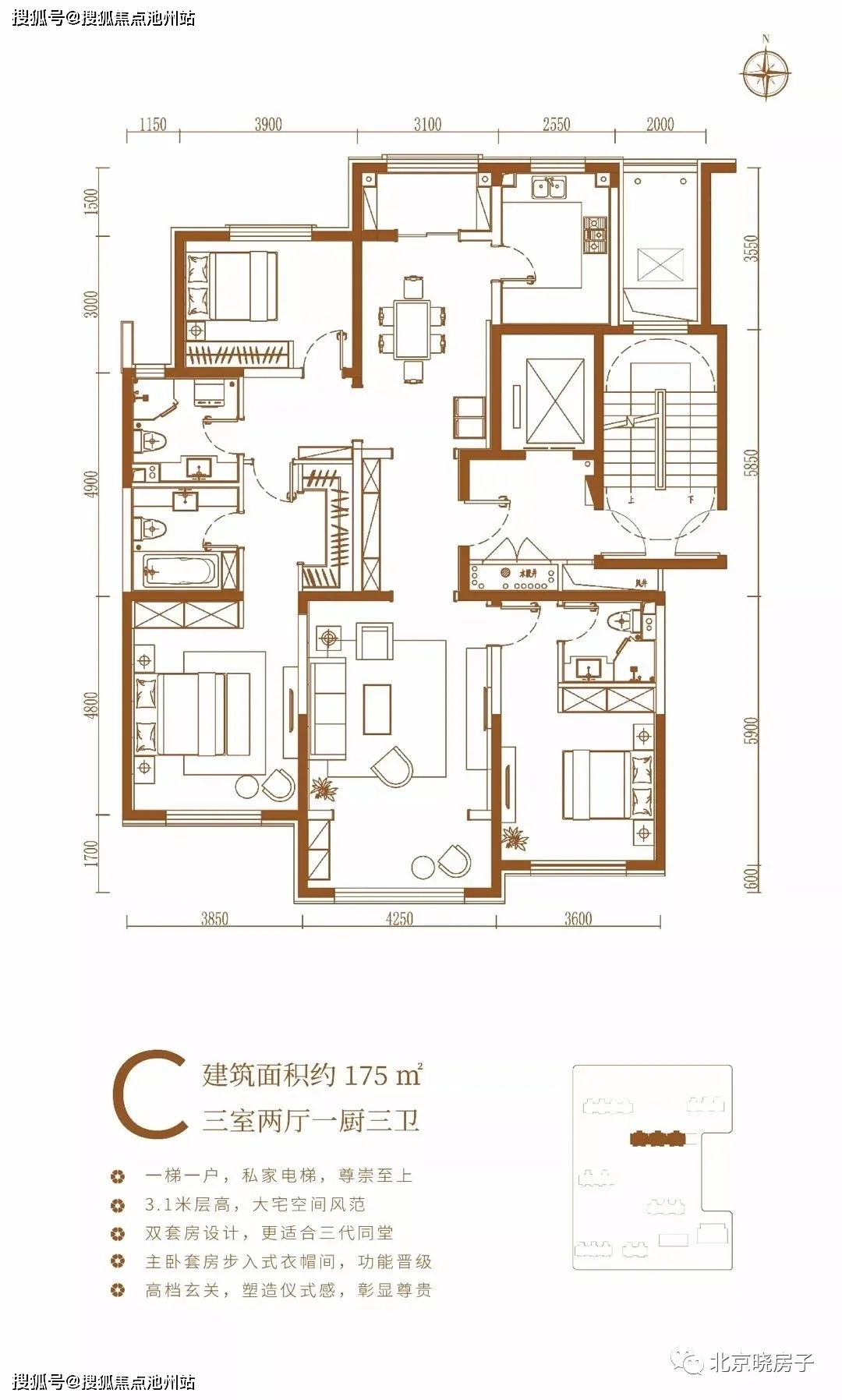 175平三居也是面积较大的户型,一梯一户,私家电梯,南北通透,南向三面宽,双套房设计,主卧带衣帽间,还有浴缸,北侧餐厅和厨房连接,餐厅旁边还有一个北向的阳台,整个格局看起来非常舒适,宽广。