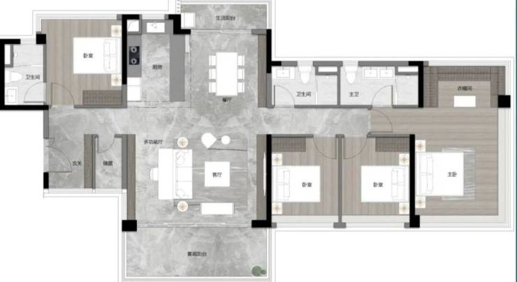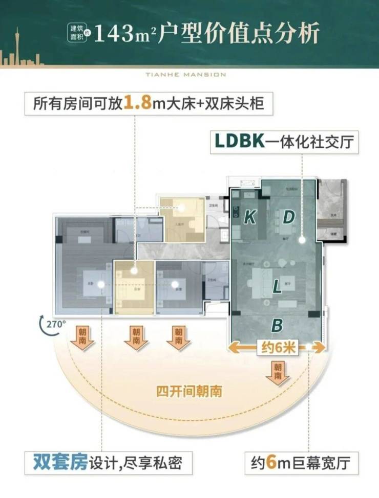 建面约123平四房,卧室都可放下1.8米大床,体验感相当于144平大宅,品质感更高。