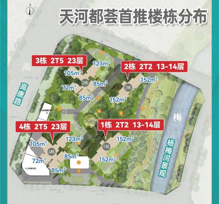 二期高层,延用一期爆款产品面积段,约72-85-105-123平3-4房;