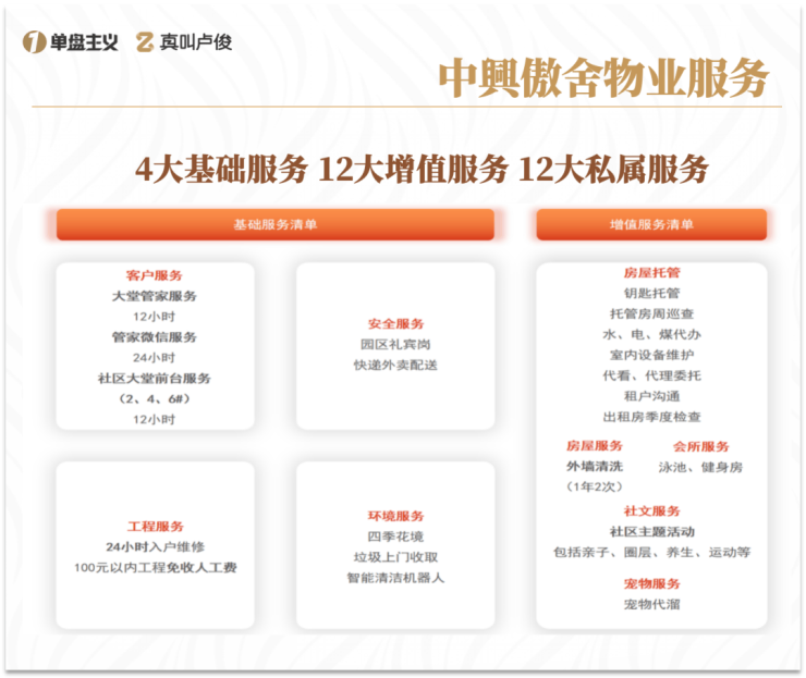 除了保有基础的物业服务,涵盖4大基础服务、12大增值服务以及12大私属服务