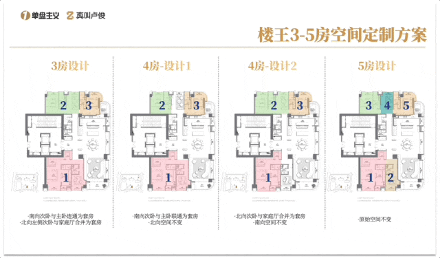 在这里你可以根据家庭结构及需求实现3-5房不同空间定制,大家注意看图中闪烁的地方,核心就在于两个空间,来自北向X空间和南向次卧的改造