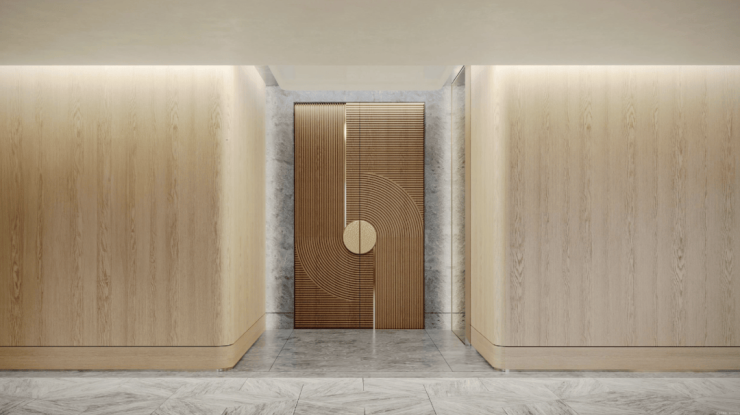 艺术化的贝母纹路通过纹路线条设计呈现出一种柔美的韵律,又和两侧木饰面形成呼应,让用户的每一次入户如画卷般展开