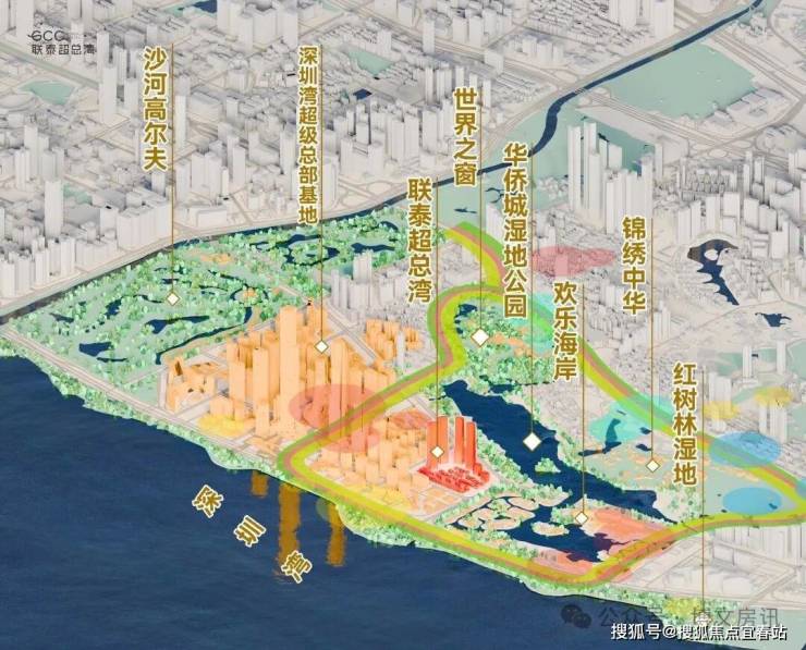 ▌超级生态融合║山海城共生的韧性城市深超总拥有海、湖、湿地、公园、高尔夫五重稀缺生态资源,通过中央绿轴打造"超级校园"生态模式。滨海大道下沉,将释放约10万平方米地面空间,无缝连接深圳湾公园,形成连续的滨海公共空间。中央绿轴地下空间面积约30万平方米,投资95亿元,将建成连接地下枢纽与地面生态的超级系统。这种设计使深超总成为高密度城市环境下生态融合的典范,实现"在城市中漫步自然,在自然中享受城市"。
