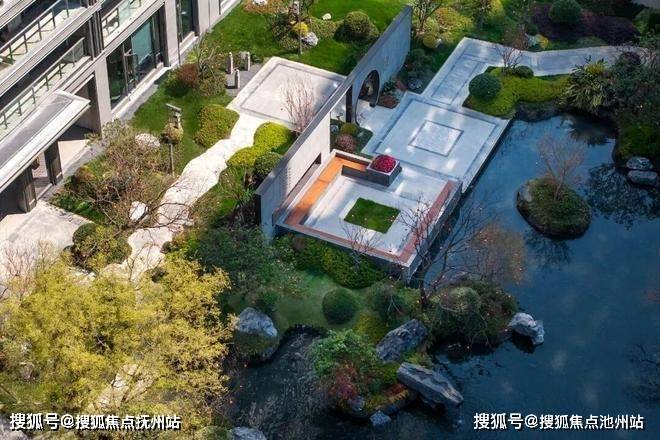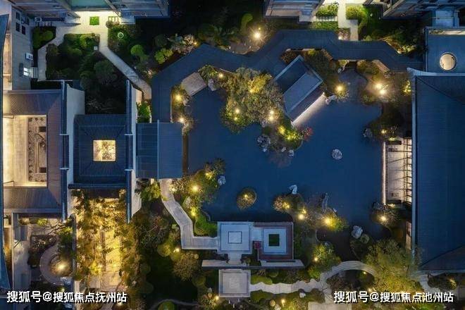 从架空层出来,进入室外园林。整个项目占地约155亩,合计约3万方新中式园林,换算下来差不多是一座城市公园的体量。