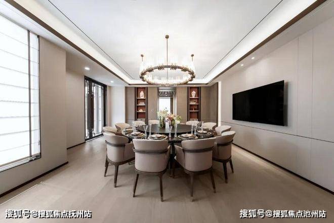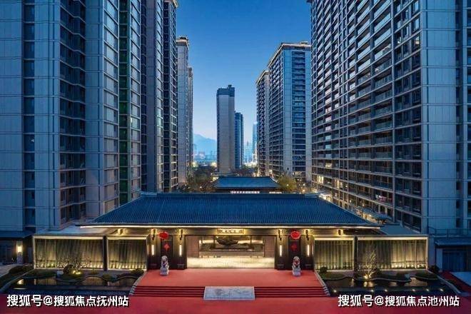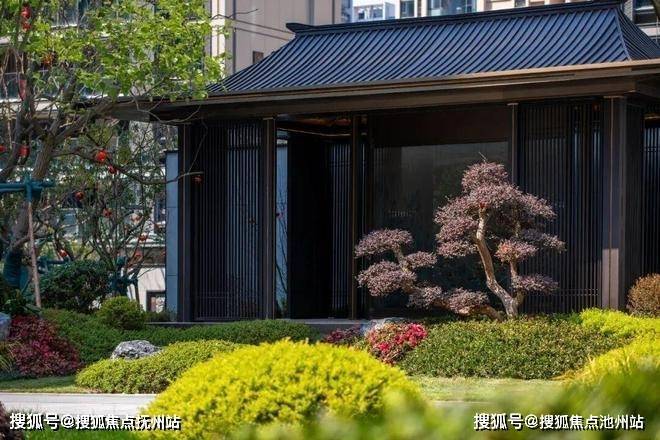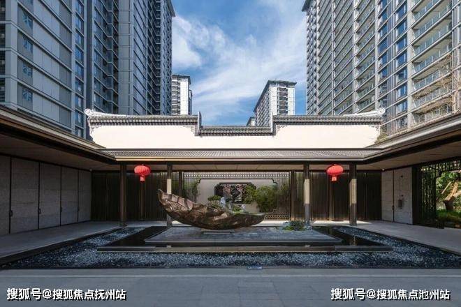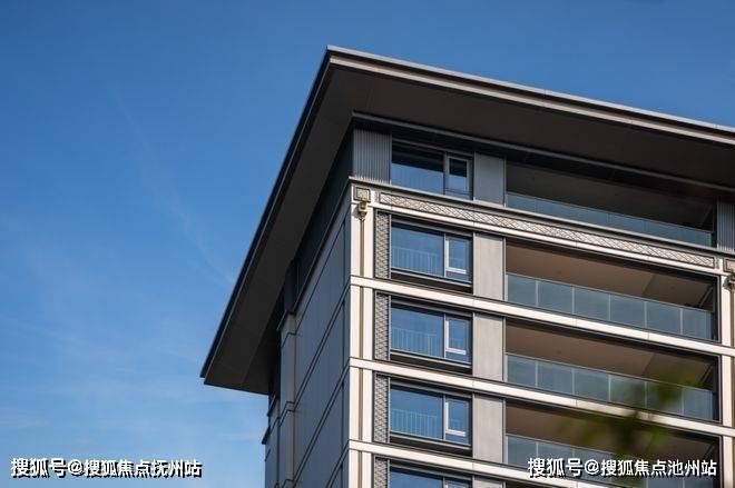 视线从园林上移,映入眼帘的是颜值出众的住宅立面。底部石材干挂,中部灰色铝板+大面积玻璃,屋顶中式唐风挑檐,每层楼的格栅祥云图样的镂空设计点缀。
