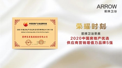 9月17日,由中国房地产业协会、上海易居房地产研究院中国房地产测评中心主办的「2020中国房地产企业品牌价值测评成果发布会暨房地产品牌发展高峰论坛」在上海隆重举办,箭牌卫浴凭借强大的品牌实力成为卫浴行业少有上榜“中国房地产优选供应商营销增值力品牌5强”。