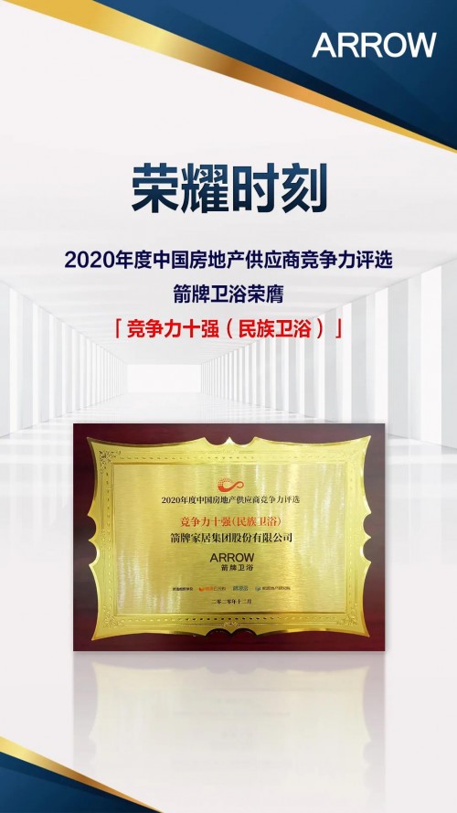 12月11日,2020年度中国房地产采购峰会暨标杆开发商与优秀供应商颁奖典礼在上海国家会展中心隆重召开。箭牌卫浴成功获得『2020年度中国房地产供应商竞争力评选十强 』荣誉,并位列民族卫浴类榜单排名前列。