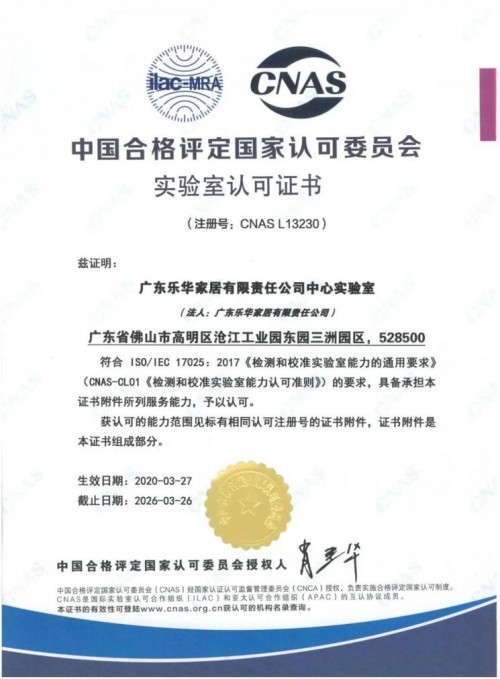 箭牌家居集团股份有限公司旗下的广东乐华家居有限责任公司中心实验室于2019年12月通过国家CNAS专家组的现场评审,并于2020年3月27日正式获取资质认可证书。