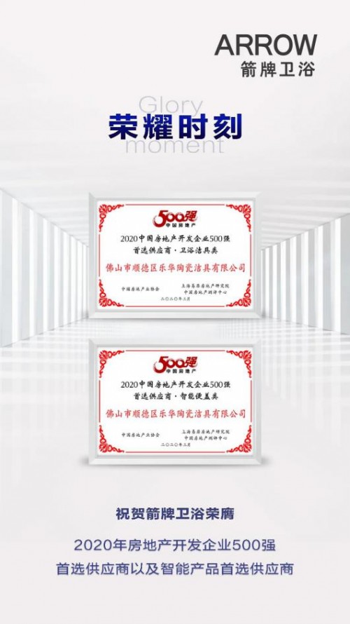 3月18日,2020年中国房地产500强测评成果发布会盛大举行。箭牌卫浴以强大的品牌实力、高品质的产品与服务,荣膺“2020年房地产开发企业500强优选供应商以及智能产品优选供应商”。