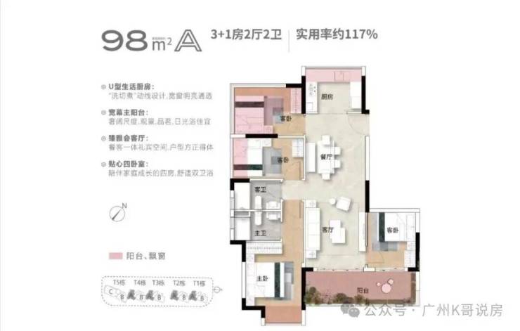 约98平户型,可改造为3+1房2厅2卫格局,适合改善家庭一步到位。比较大的看点就是主卧自带大飘窗,客卧与主阳台直接连通。