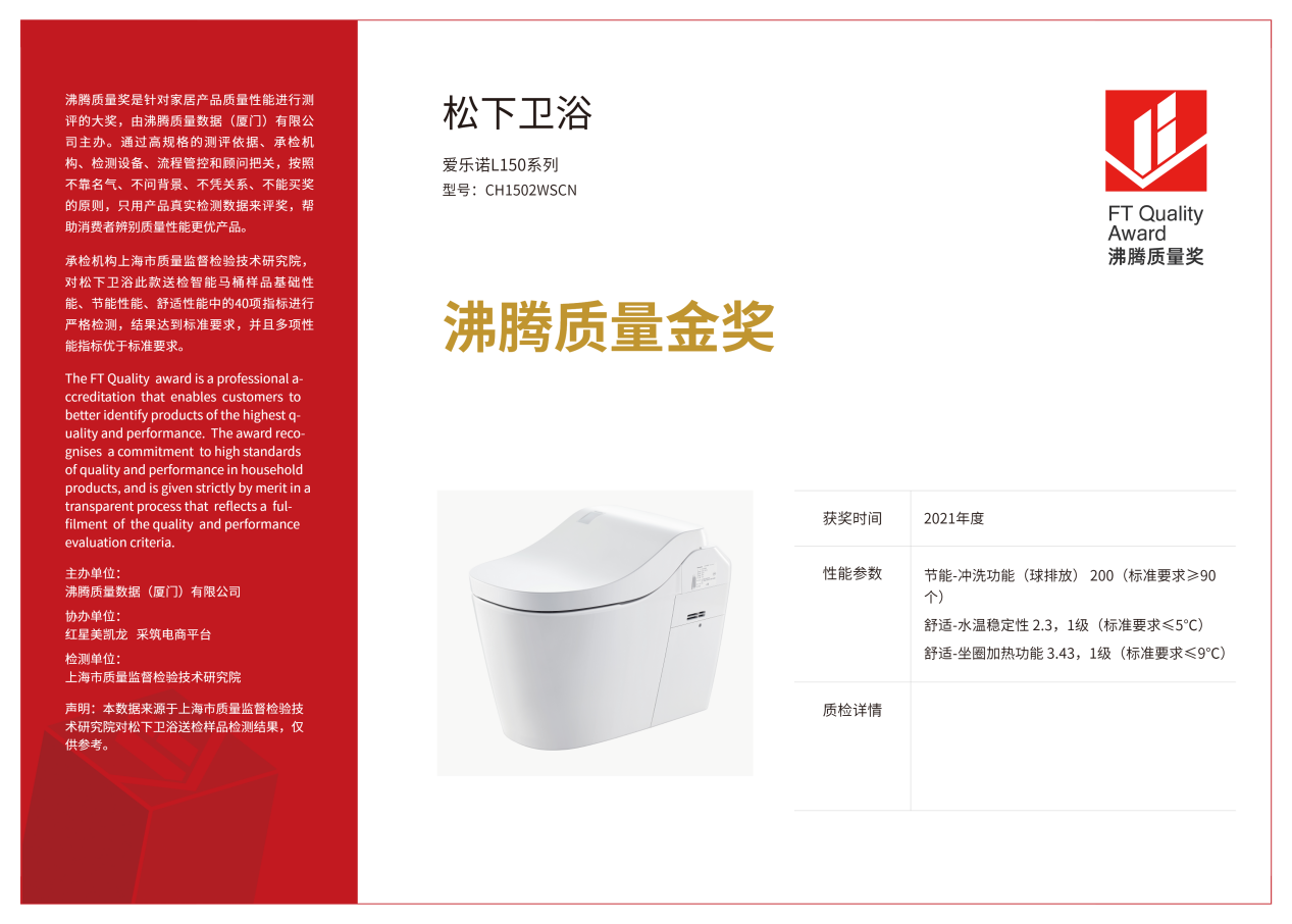 2022年3月15日,松下卫浴爱乐诺L150系列自动座便器,获得2021年度“沸腾质量金奖”。