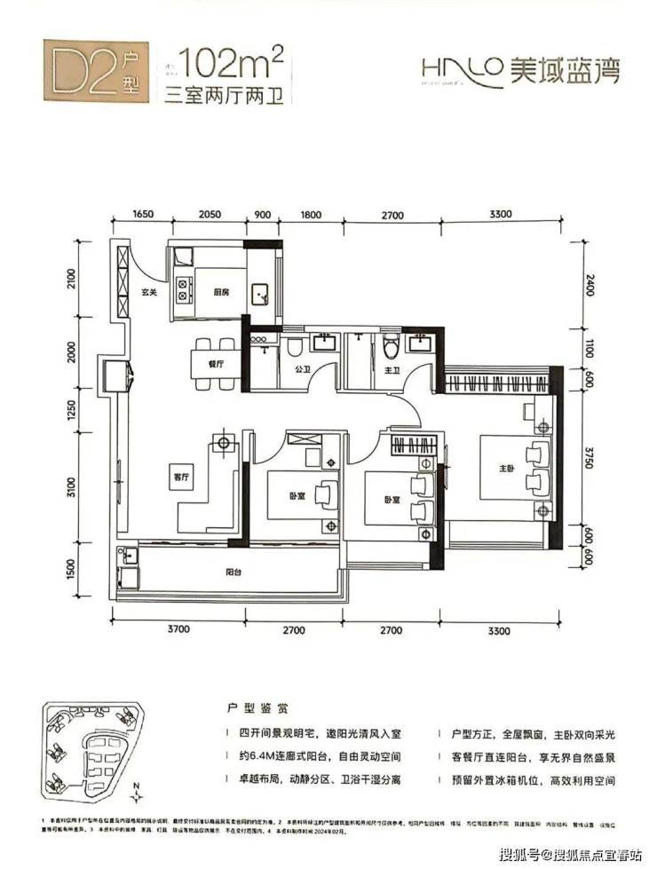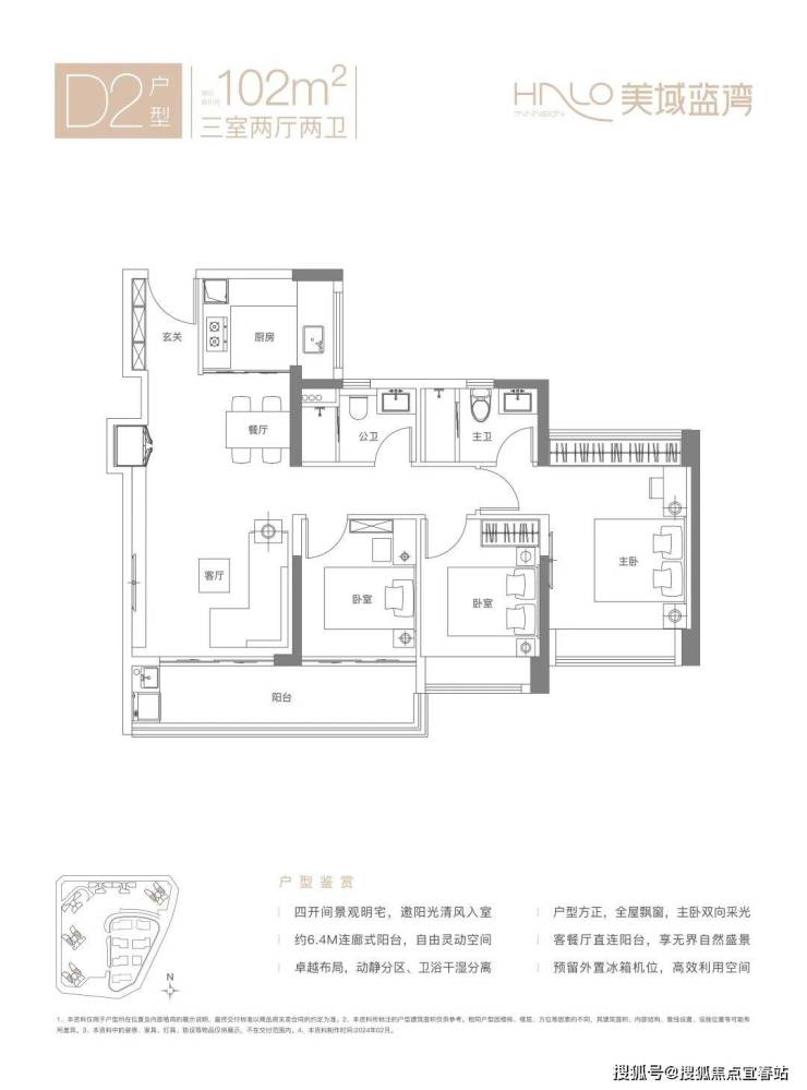 D2户型-102㎡的3房2厅2卫,设计的是竖厅格局,客厅连接卧室出阳台(有6.4米长),四开间朝南,S墙设计预留冰箱位,主卧双飘窗南北对流,U型厨房,得房率:80.11%(不含赠送),有东北向或西南朝向。