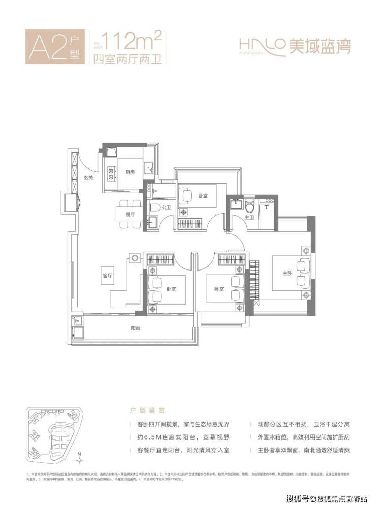 A2户型-112㎡的4房2厅2卫,设计的是竖厅格局,客厅连接次卧出阳台(有6.5米长),四开间朝南,S墙设计预留冰箱位,主卧双飘窗南北对流,U型厨房,得房率:80.12%(不含赠送),有西南或东北朝向。