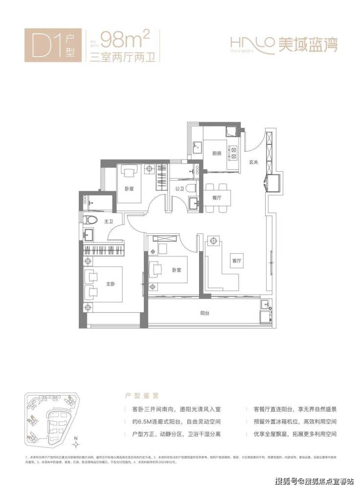 D1户型-98㎡的3房2厅2卫,设计的是竖厅格局,客厅连接次卧出阳台(有6.5米长),三开间朝南,S墙设计预留冰箱位,U型厨房,得房率:80.12%(不含赠送),有西南向或东北朝向。