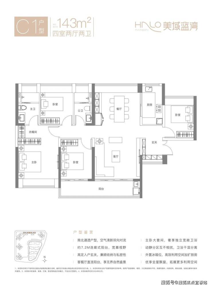 143㎡的4房2厅2卫,C2户型,设计的是竖厅双龙抱珠格局,进门入户玄关,客厅4.4米开间,LDKB一体化设计,五开间朝南,4个卧室分别做到了主卧22.04㎡/次卧11.48㎡/次卧10.8㎡/次卧9㎡(包含墙体飘窗),客厅连接次卧出7.4米长的巨幕大阳台,U型厨房,卫生间干湿分离,得房率约77.13%(不含赠送),正南朝向。