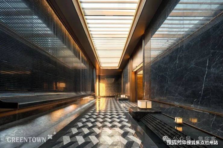 主入口知·云栖,取意西湖十景以"洄游"为理念,超52米跨度的回字形布局,重构传统"四水归堂"空间序列,约2.4米“流光礼宾” 塔冠,如悬浮的美学灯塔,与金色挑檐相映成辉,全封闭式阳台勾勒建筑轮廓,让立面如镜幕般收纳约30公里江岸鎏光!
