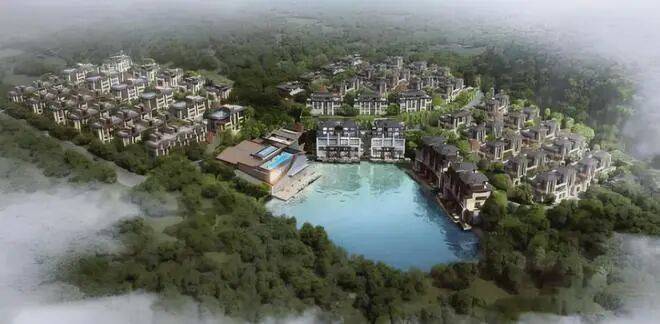 项目沿自然山脉地势而建,利用三面环山和地块落差的优势条件,采用“多台地”的布局,让每一栋视线不受遮挡,营造出背山靠湖的空间布局。
