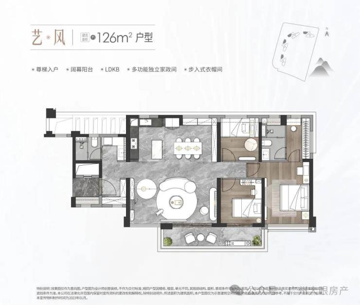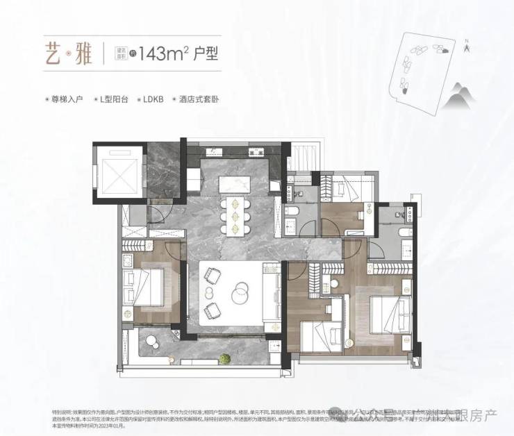 中海麓府体量不大,仅4栋住宅,40多层高的住宅(1#高40层,2-3#高44层,5#高41层),两梯三户,底下规划有1所12班幼儿园+1栋自持物业,货量在500套上下,它的面积段有三种,分别是建面约126㎡三房、143㎡和170㎡的四房