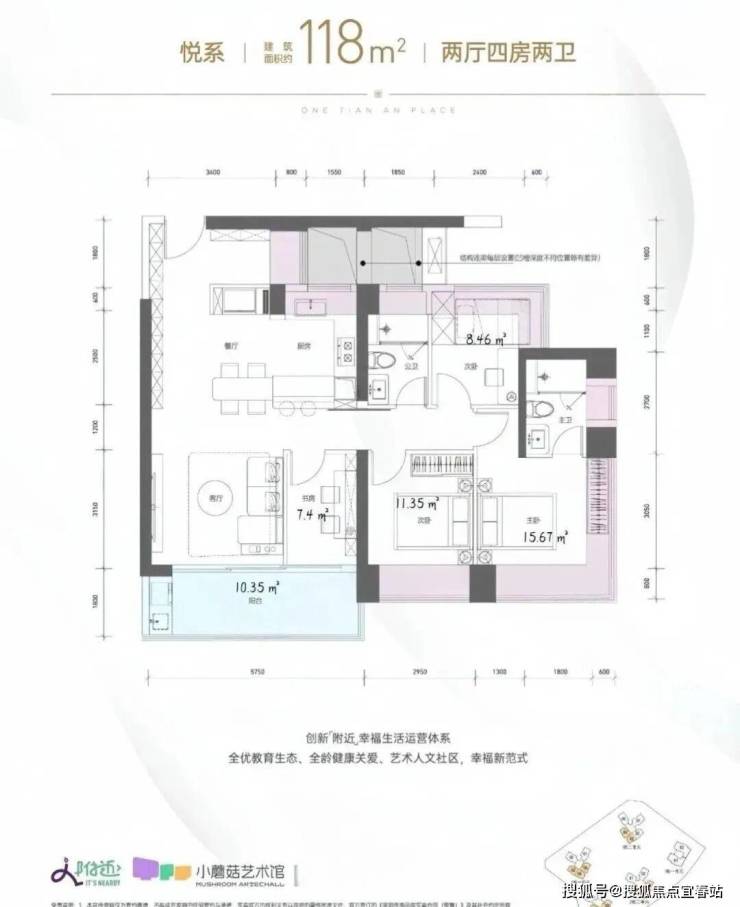 118㎡的4房2厅2卫,1栋2单元02户型,设计的是竖厅格局,进门约6.12平的入户玄关位,客厅3.5米开间,LDKB一体化设计,四开间朝南,动静分区,分别做到了主卧15.67㎡/次卧11.35㎡/次卧8.46㎡/次卧7.4㎡(包含墙体飘窗),客厅连接次卧出5.75米长的大阳台约10.35平,U型厨房,公卫三段式干湿分离,得房率约96.5%(包含赠送),东南朝向。这个户型区别之处在于公卫,卧室,飘窗赠送面积14.31㎡+阳台赠送面积5.17㎡=实际赠送19.48㎡。