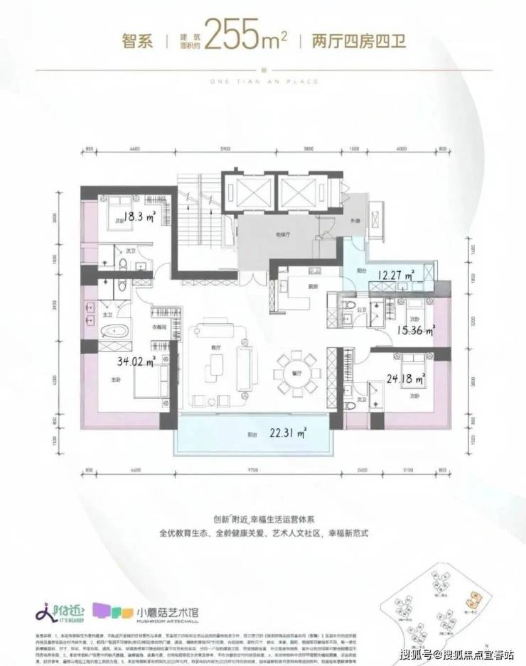 255㎡的4房2厅4卫,1栋1单元01/02户型,设计的是竖厅双龙抱珠格局,专梯入户送超大私用入户空间,客厅9.7米开间,LDKB一体化设计,主卧带大衣帽间,三套房设计,分别做到了主卧34.02㎡/次卧24.18㎡/次卧18.3㎡/次卧15.16㎡(包含墙体飘窗),客厅连接餐厅出9.7米长的大阳台约22.31平,J型厨房带1个生活阳台约12.27平,卫生间干湿分离,得房率约96.7%(包含赠送,不含入户空间),西南或东北朝向。飘窗赠送面积24.8㎡+阳台赠送17.29㎡=实际赠送42.09㎡(不含电梯入户空间)。