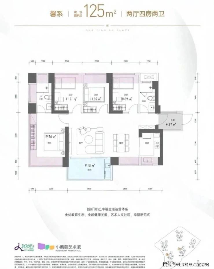 125㎡的4房2厅2卫,2栋2/3单元01户型,设计的是横厅南北通透格局,独门独户,赠送约4.37平的入户空间,客餐厅7.15米开间,LDKB一体化设计,四开间朝南,分别做到了主卧19.76㎡/次卧11.21㎡/次卧11.02㎡/次卧10.64㎡(包含墙体飘窗),客厅出阳台约9.13平,U型厨房,卫生间干湿分离,得房率约99.29%(包含赠送),西南朝向。飘窗赠送面积15.18㎡+阳台赠送4.56㎡+外廊赠送4.37㎡=实际赠送24.11㎡。